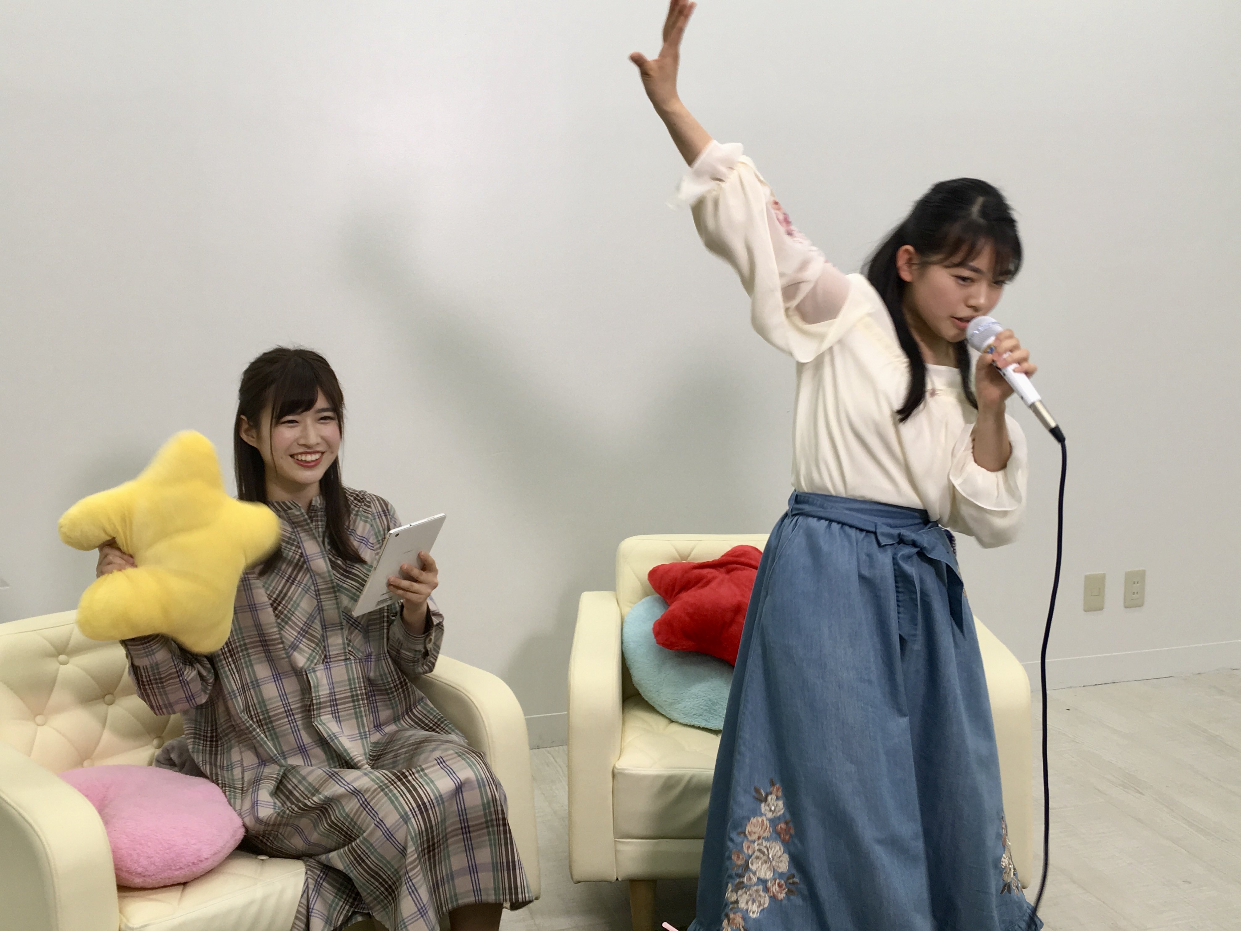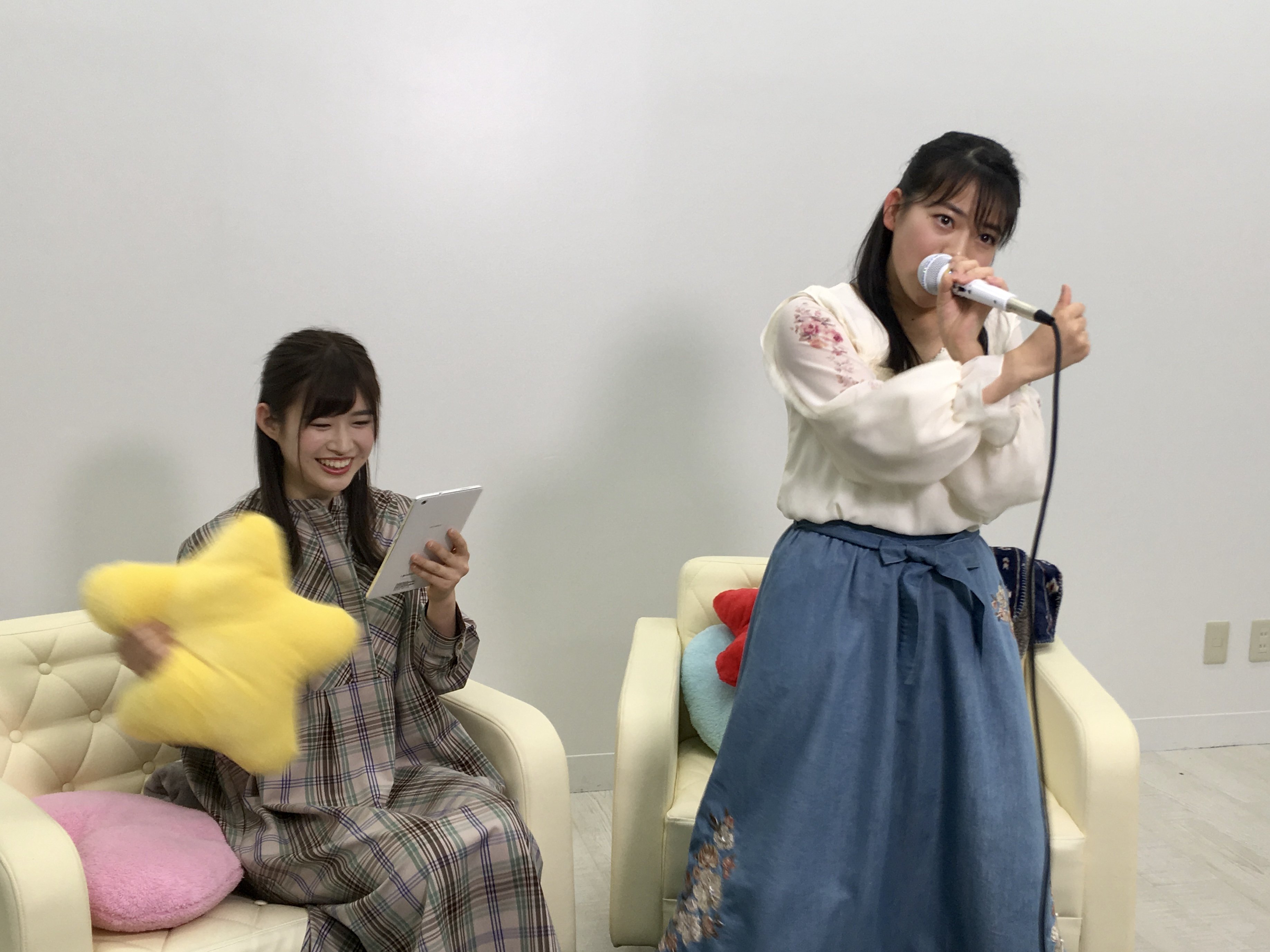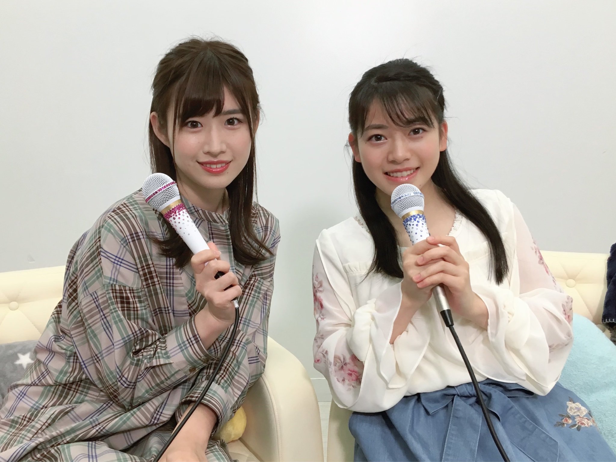 4月26(金)に配信された「猫舌SHOWROOM 指カラ」から、AKB48 チーム8の佐藤朱さんと高岡薫さんのオフショットです。